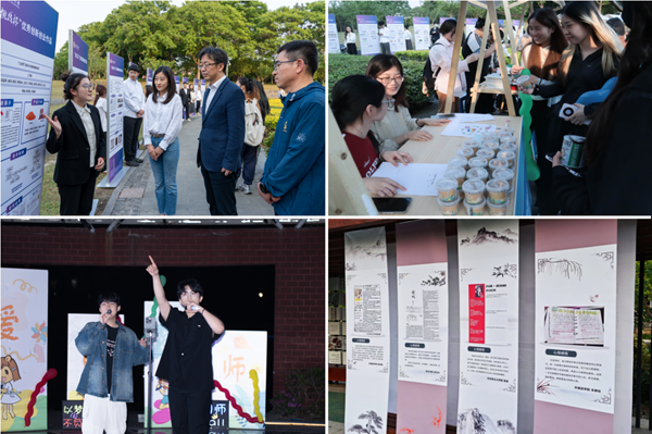 在月亮广场入口处举办的“青爱的创想+”挑战杯优秀项目展引来大批师生驻足观看,他们观摩讨论优秀项目成果,在思维碰撞中探寻创新灵感。“青爱的理想集”学生社团活动在月亮广场如火如荼地进行,各社团摊位前人头攒动,同学们积极参与趣味游戏、手工体验等特色活动,沉浸式感受丰富多彩的校园文化活动。不少同学在安吉园吴昌硕文化廊观看“青爱的书适圈”优秀读书摘抄展示,借助青年读者分享的心得体悟走进文学世界,挖掘多样的阅读内容,摩擦出思想的火花。在校园另一端,“青爱的音乐会”校园歌手展演活动中,十佳歌手们轮番登台,尽情展露青春风采,用歌声表达爱乐之心,台下的观众们纷纷跟随着节奏欢呼,喝彩声浪将现场氛围一次次推向高潮。